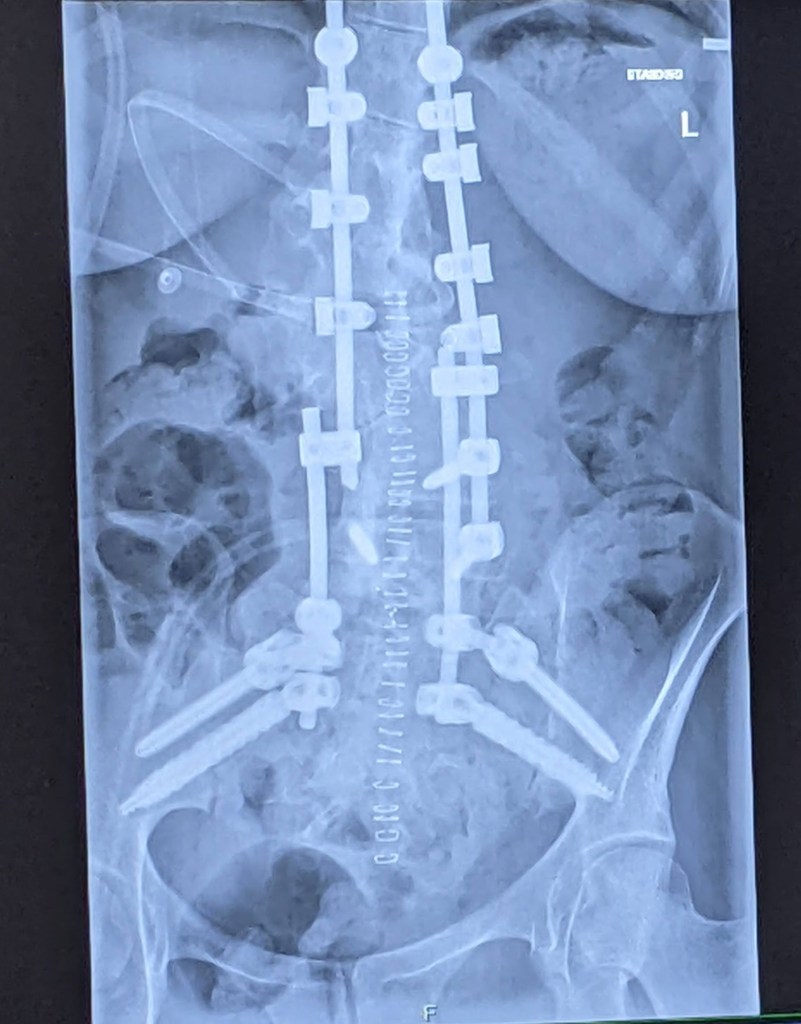 I know my post-op x-ray above isn’t as clear as the pre-op one – I had a wound-vac and staples in at the time. To summarize – in the surgery they took out my S1 screws from 2.5 years ago due to their proximity to S1 nerve root and repositioned the one on the right side (they actually just left out the left S1 screw because there wasn’t space, my vertebrae are weird). Then they removed the S2 AI screws and repositioned them with this new technology of 3D printed screws that are supposed to more successfully fuse to bone. Then they put in more screws and bone graft to fuse my sacroiliac joint and hopefully better distribute the weight of my spine across my pelvis. They tracked my nerve signals throughout the procedure and on my left side, my signals actually improved, which is best case scenario!